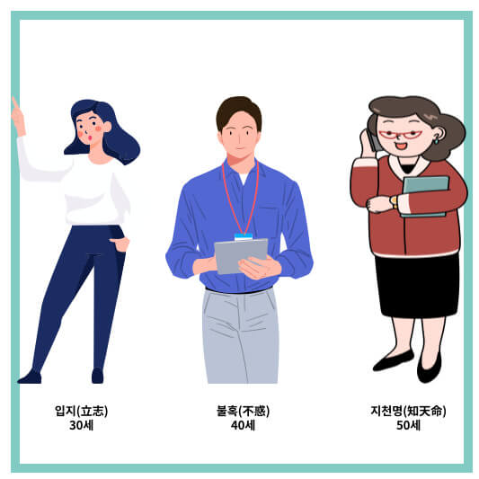 40세는 인생에서 현명해지고 미혹에서 벗어나는 시기를 나타냅니다. - 50세: 지천명(知天命) - 하늘의 뜻을 앎