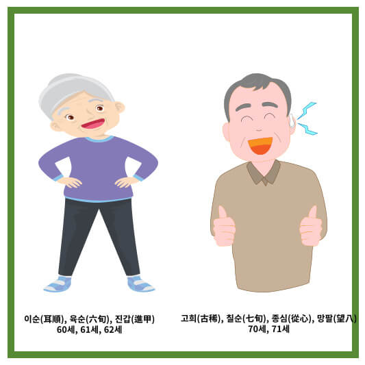- 60세: 이순(耳順), 육순(六旬) - 듣는 대로 이해하고 예순 살을 이르는 말