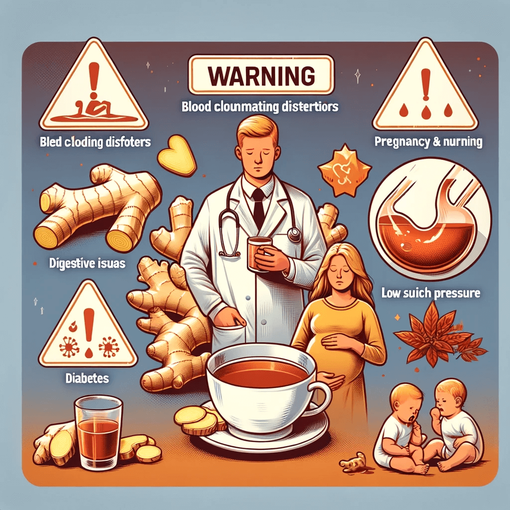 1. 혈액 응고 장애: 생강은 혈액을 묽게 하는 효과가 있어, 혈액 응고 장애가 있는 사람들이나 항응고제를 복용하는 사람들은 생강차 섭취 전에 의사와 상담해야 합니다.